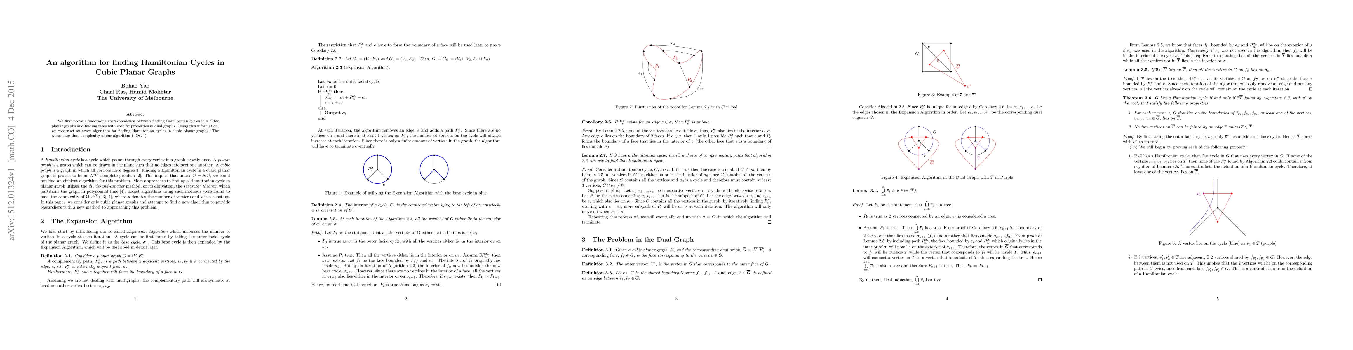 Summary: This paper establishes a correspondence between Hamiltonian cycles in cubic planar graphs and specific trees in their dual graphs, then develops an exact algorithm with a worst-case time complexity of O$(2^n)$ to find Hamiltonian cycles in cubic planar graphs.