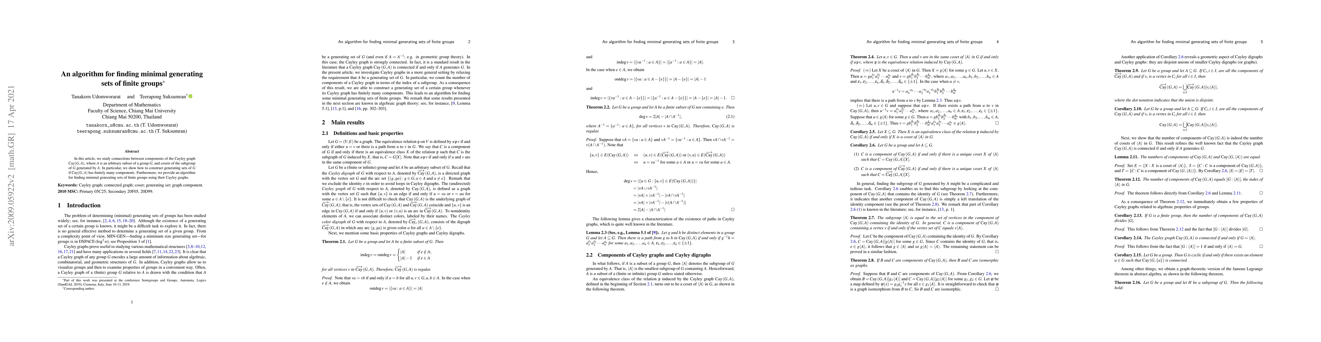 This paper explores the relationship between components of a Cayley graph and cosets of a subgroup generated by a subset, presenting an algorithm to find minimal generating sets of finite groups using their Cayley graphs when the graph has finitely many components.