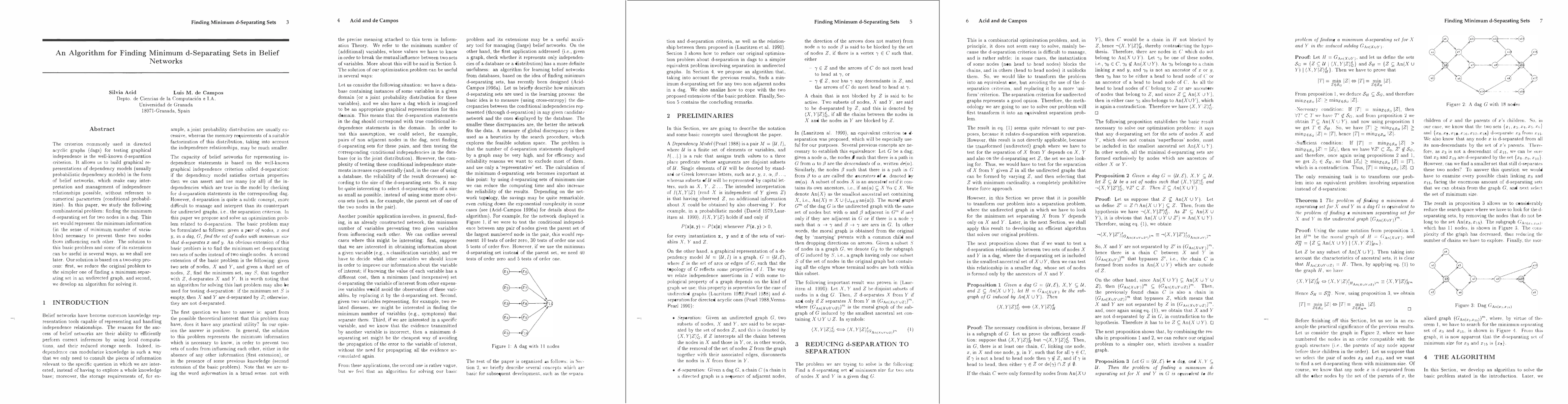 This paper proposes an algorithm to find minimum d-separating sets in belief networks, which represent the smallest set of variables needed to prevent influence between two nodes in a directed acyclic graph. The solution involves reducing the problem to finding a minimum separating set in an undirected graph and developing an efficient algorithm for this purpose.