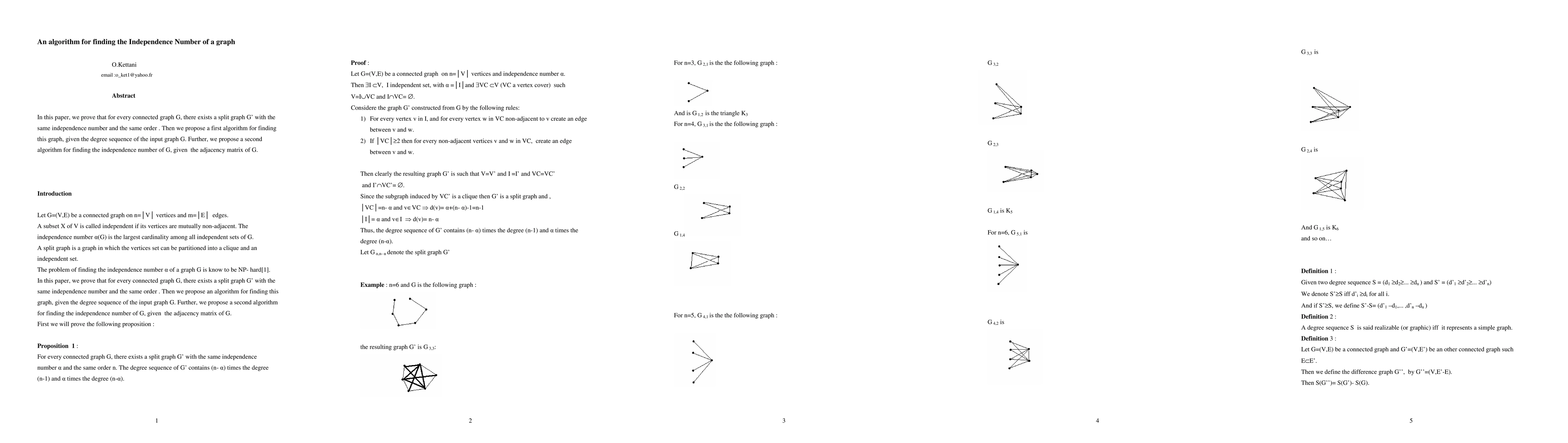 In this paper, we prove that for every connected graph G, there exists a split graph H with the same independence number and the same order. Then we propose a first algorithm for finding this graph, given the degree sequence of the input graph G. Further, we propose a second algorithm for finding the independence number of G, given the adjacency matrix of G.