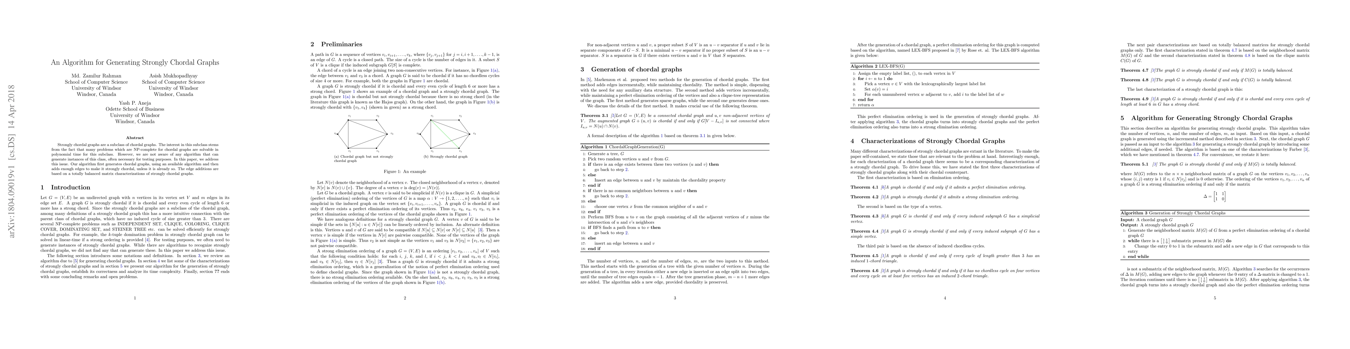 This paper presents an algorithm to generate strongly chordal graphs by first creating chordal graphs and then adding edges to meet the strongly chordal criteria, leveraging a totally balanced matrix characterization. This addresses the need for generating instances of strongly chordal graphs for testing purposes.