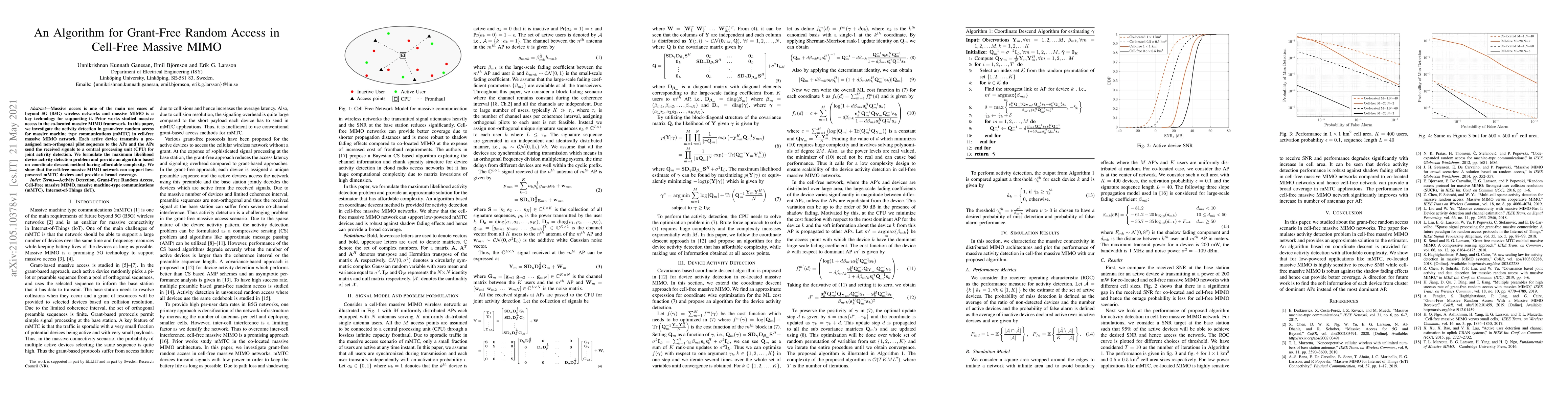 This paper proposes an algorithm for grant-free random access in cell-free massive MIMO networks, focusing on activity detection for massive machine type communications. The algorithm uses a coordinate descent method for efficient joint activity detection and demonstrates the network's ability to support low-powered devices with broad coverage.