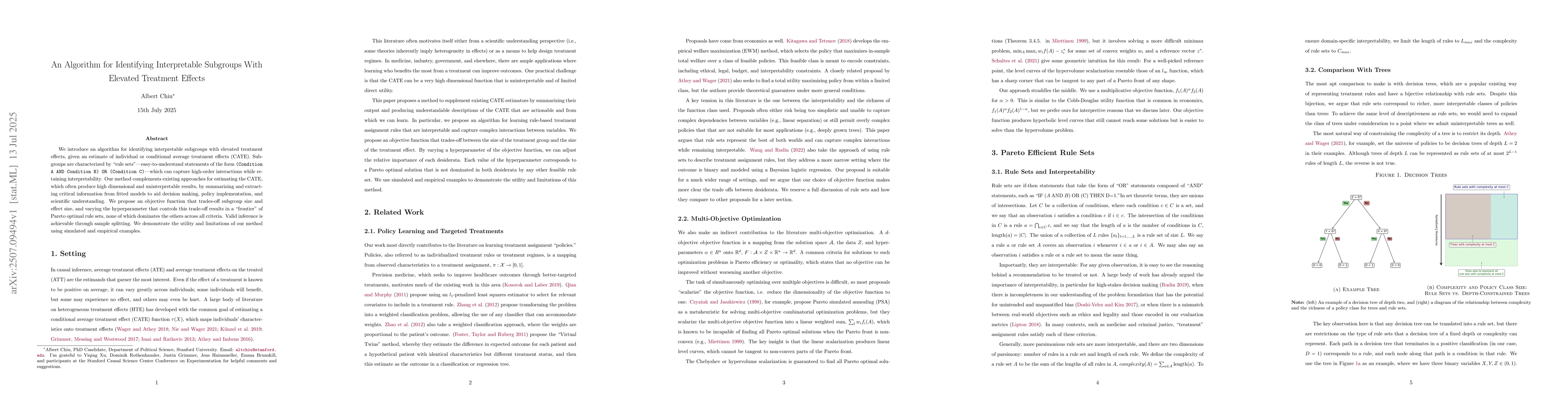 We introduce an algorithm for identifying interpretable subgroups with elevated treatment effects, given an estimate of individual or conditional average treatment effects (CATE). Subgroups are characterized by ``rule sets'' -- easy-to-understand statements of the form (Condition A AND Condition B) OR (Condition C) -- which can capture high-order interactions while retaining interpretability. Our method complements existing approaches for estimating the CATE, which often produce high dimensional and uninterpretable results, by summarizing and extracting critical information from fitted models to aid decision making, policy implementation, and scientific understanding. We propose an objective function that trades-off subgroup size and effect size, and varying the hyperparameter that controls this trade-off results in a ``frontier'' of Pareto optimal rule sets, none of which dominates the others across all criteria. Valid inference is achievable through sample splitting. We demonstrate the utility and limitations of our method using simulated and empirical examples.