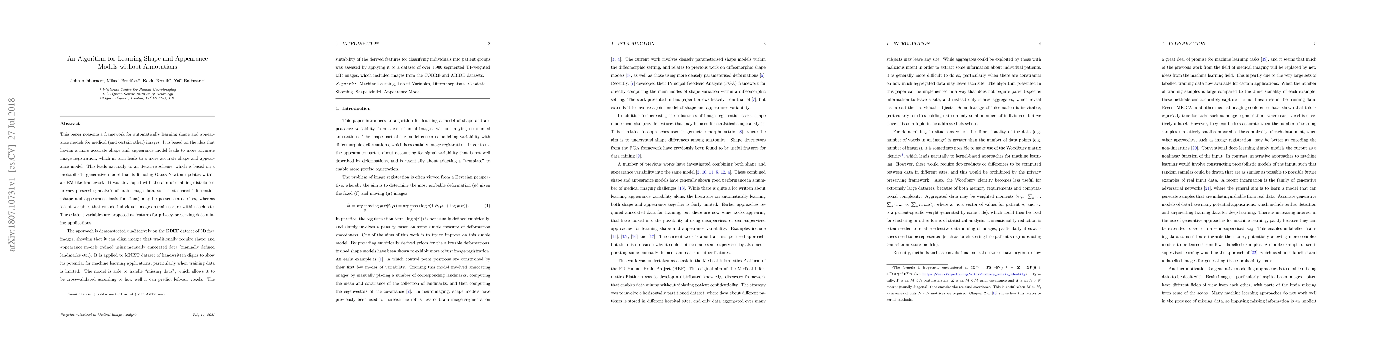 This paper introduces an algorithm that learns shape and appearance models for medical images without manual annotations, using an iterative, probabilistic generative model. It demonstrates effectiveness on face and digit datasets, handling missing data and showing potential for privacy-preserving, distributed data analysis in neuroimaging, with over 1,900 T1-weighted MR images tested.
