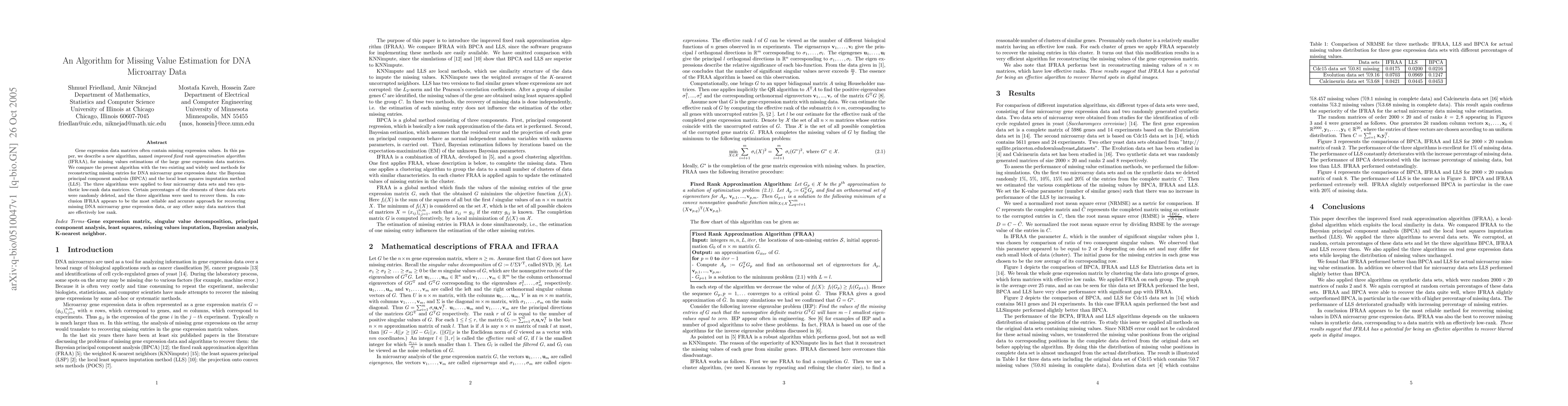 Gene expression data matrices often contain missing expression values. In this paper, we describe a new algorithm, named improved fixed rank approximation algorithm (IFRAA), for missing values estimations of the large gene expression data matrices. We compare the present algorithm with the two existing and widely used methods for reconstructing missing entries for DNA microarray gene expression data: the Bayesian principal component analysis (BPCA) and the local least squares imputation method (LLS). The three algorithms were applied to four microarray data sets and two synthetic low-rank data matrices. Certain percentages of the elements of these data sets were randomly deleted, and the three algorithms were used to recover them. In conclusion IFRAA appears to be the most reliable and accurate approach for recovering missing DNA microarray gene expression data, or any other noisy data matrices that are effectively low rank.