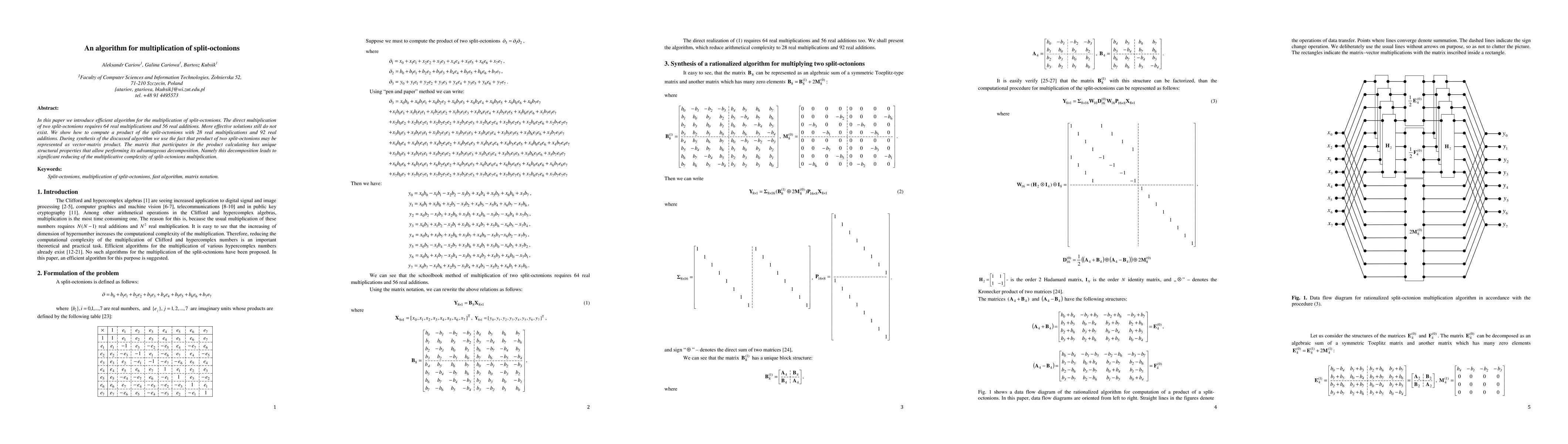 In this paper we introduce efficient algorithm for the multiplication of split-octonions. The direct multiplication of two split-octonions requires 64 real multiplications and 56 real additions. More effective solutions still do not exist. We show how to compute a product of the split-octonions with 28 real multiplications and 92 real additions. During synthesis of the discussed algorithm we use the fact that product of two split-octonions may be represented as vector-matrix product. The matrix that participates in the product calculating has unique structural properties that allow performing its advantageous decomposition. Namely this decomposition leads to significant reducing of the multiplicative complexity of split-octonions multiplication.