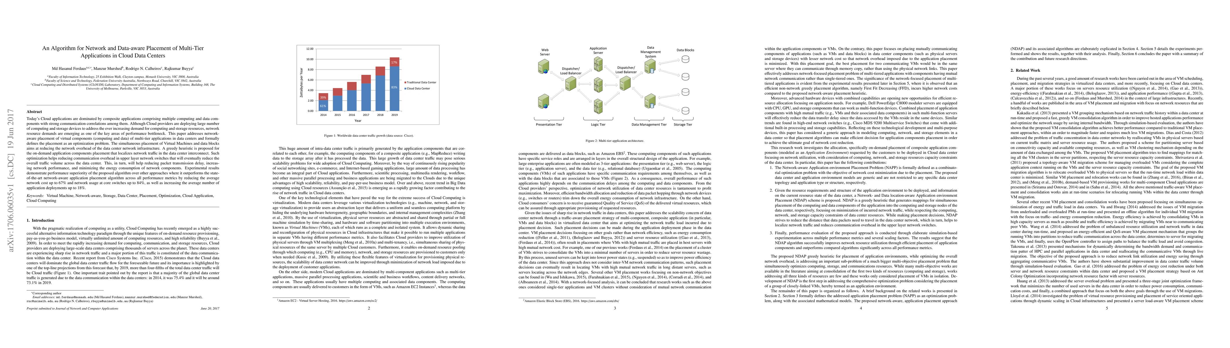 A new algorithm optimizes network and data placement for multi-tier applications in cloud data centers to reduce network overhead and increase performance, achieving up to 67% reduction in average network cost.