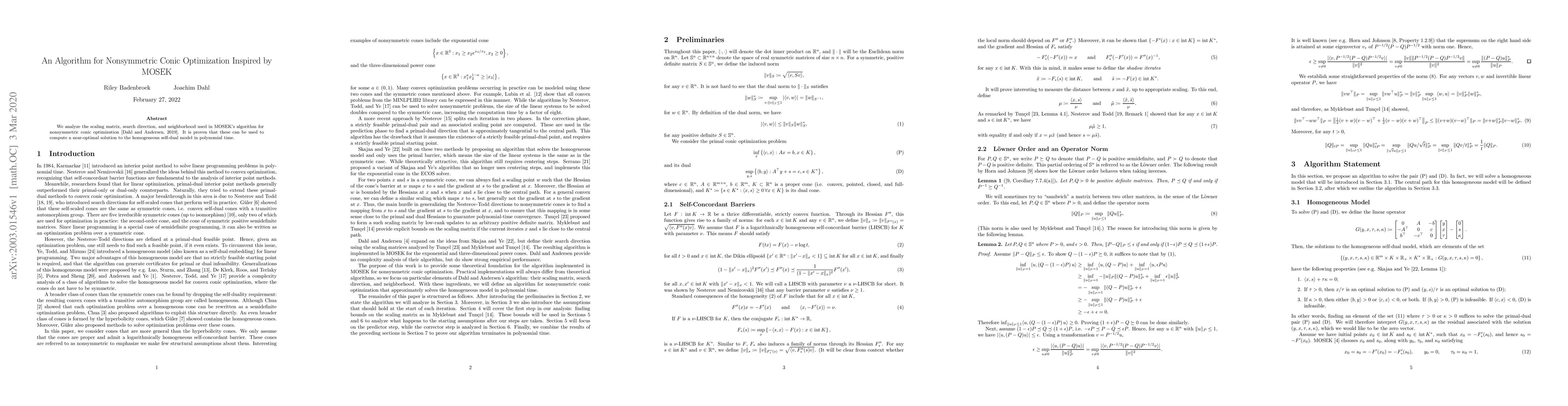 This paper investigates MOSEK's algorithm for nonsymmetric conic optimization, demonstrating that its scaling matrix, search direction, and neighborhood can compute a near-optimal solution to the homogeneous self-dual model in polynomial time. The findings suggest significant improvements in solving nonsymmetric conic optimization problems.