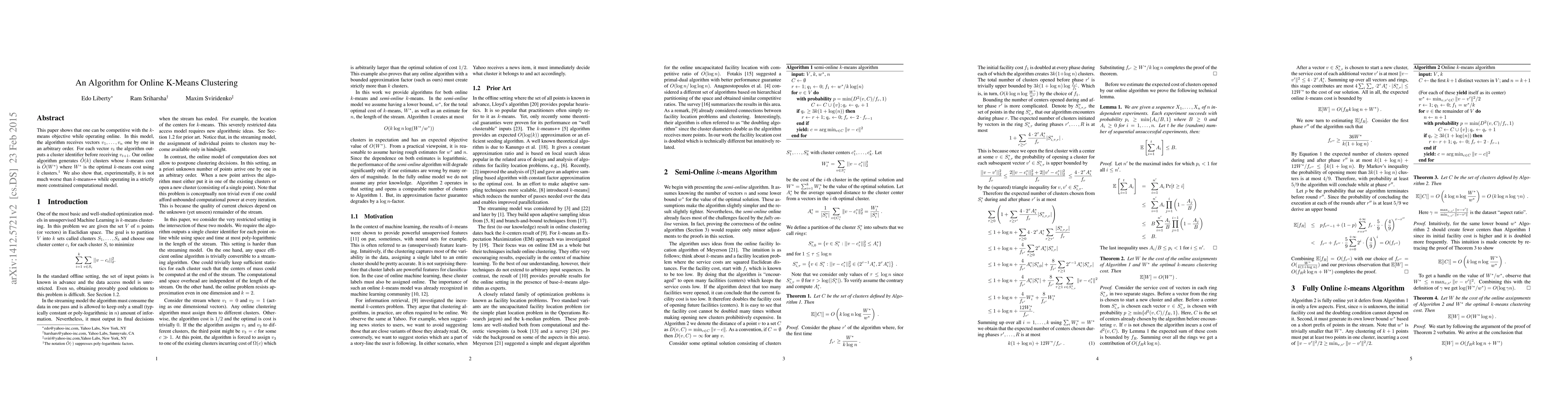 This paper presents an online algorithm for k-means clustering that competes with the k-means objective, generating ~O(k) clusters with a cost of ~O(W*), where W* is the optimal k-means cost. Experimentally, it performs nearly as well as k-means++ under more constrained computational conditions.
