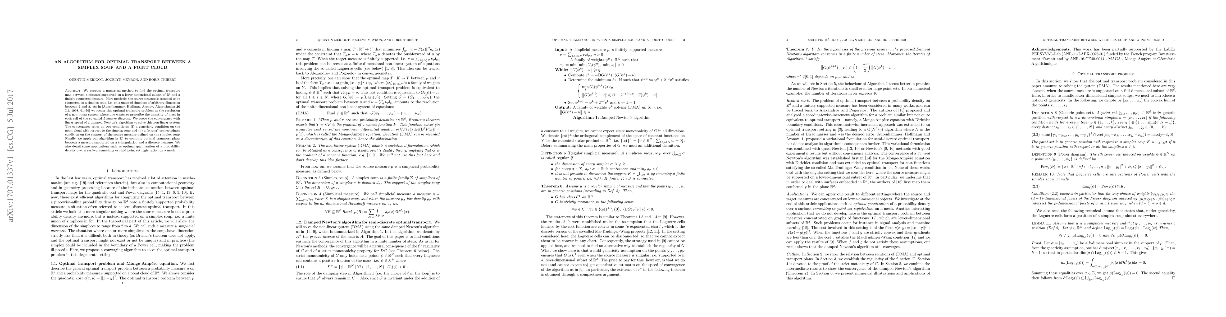 The paper introduces a numerical algorithm to determine the optimal transport map between a measure on a simplex soup and a point cloud. It recasts the problem as a non-linear system resolution using a damped Newton's method, ensuring convergence with linear speed under specific conditions. The method is demonstrated in 3D for triangulation measures and has applications in optimal quantization, remeshing, and rigid registration on meshes.