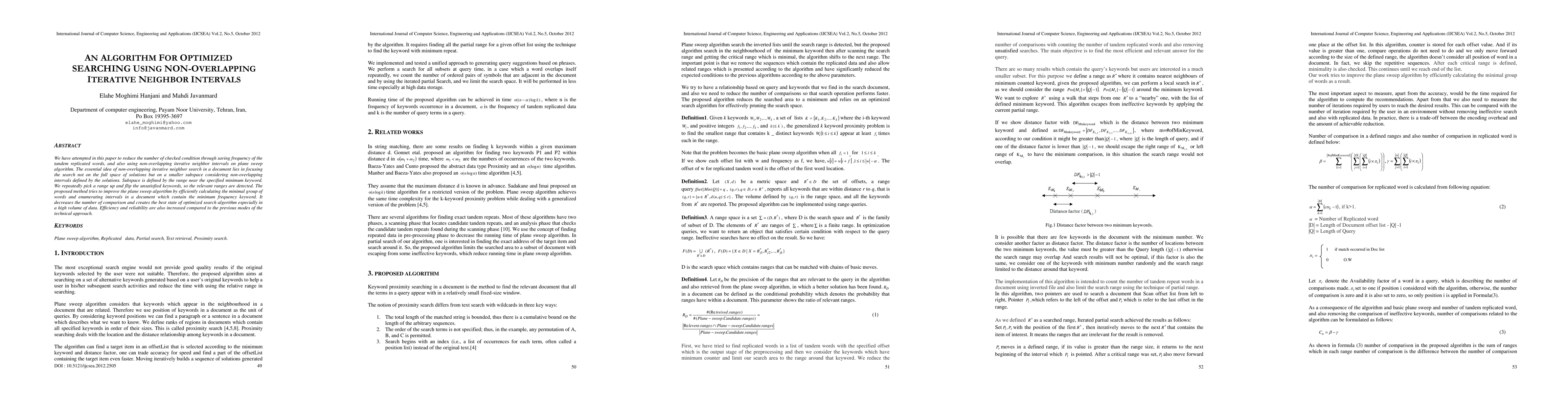 We have attempted in this paper to reduce the number of checked condition through saving frequency of the tandem replicated words, and also using non-overlapping iterative neighbor intervals on plane sweep algorithm. The essential idea of non-overlapping iterative neighbor search in a document lies in focusing the search not on the full space of solutions but on a smaller subspace considering non-overlapping intervals defined by the solutions. Subspace is defined by the range near the specified minimum keyword. We repeatedly pick a range up and flip the unsatisfied keywords, so the relevant ranges are detected. The proposed method tries to improve the plane sweep algorithm by efficiently calculating the minimal group of words and enumerating intervals in a document which contain the minimum frequency keyword. It decreases the number of comparison and creates the best state of optimized search algorithm especially in a high volume of data. Efficiency and reliability are also increased compared to the previous modes of the technical approach.