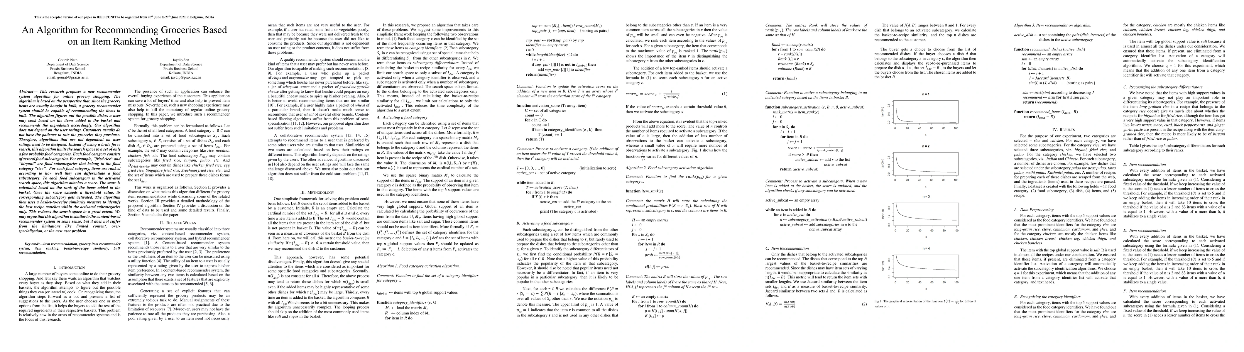 A new algorithm recommends groceries based on item ranking and limits search space to food categories and subcategories, reducing the need for user ratings.