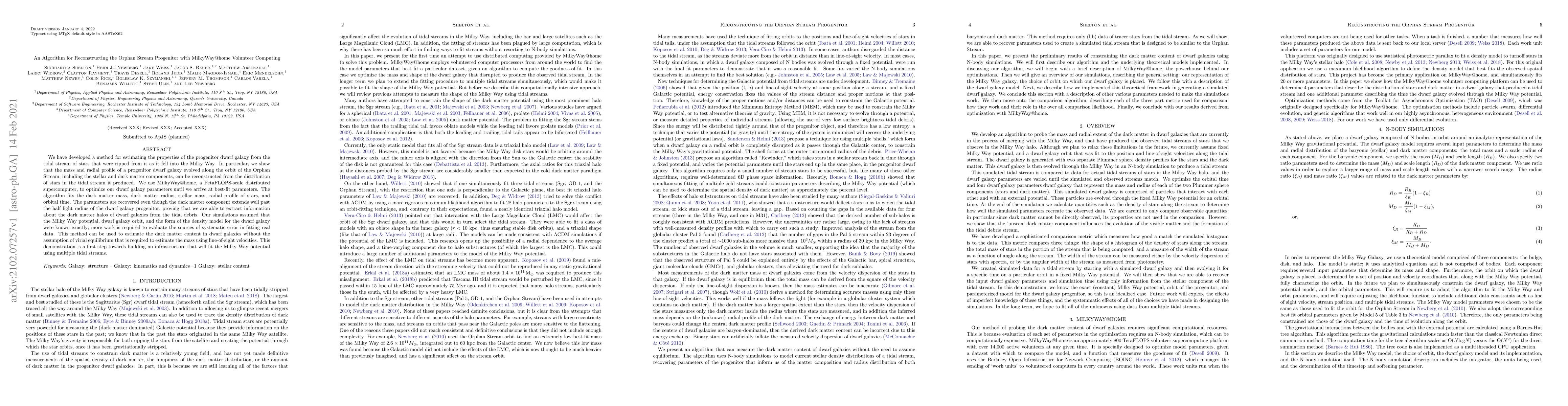 Researchers developed an algorithm to reconstruct a dwarf galaxy's properties from its tidal stream of stars, which was ripped from it as it fell into the Milky Way. They used the MilkyWay@home supercomputer to find best-fit parameters for mass, dark matter, and other components.