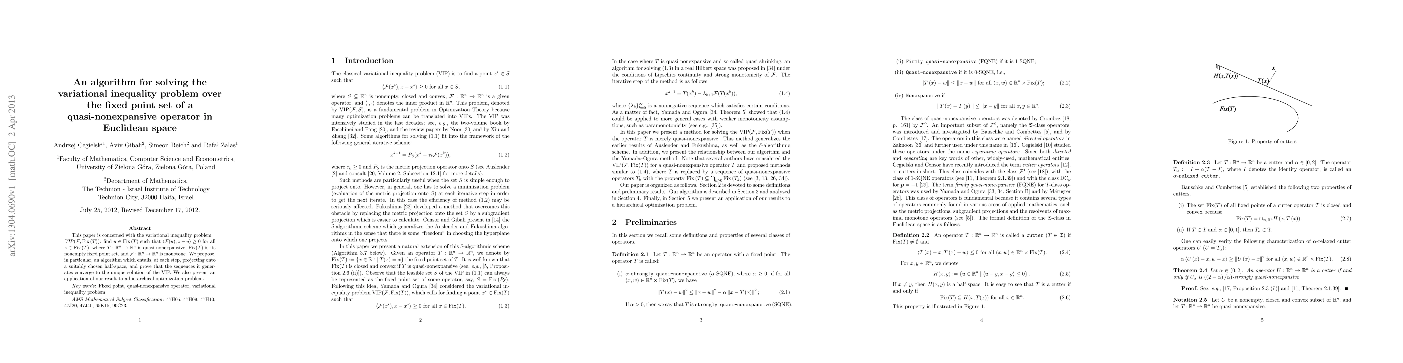 This paper proposes an algorithm for solving the variational inequality problem over the fixed point set of a quasi-nonexpansive operator, demonstrating convergence to the unique solution through projections onto half-spaces, and applies the method to a hierarchical optimization problem.