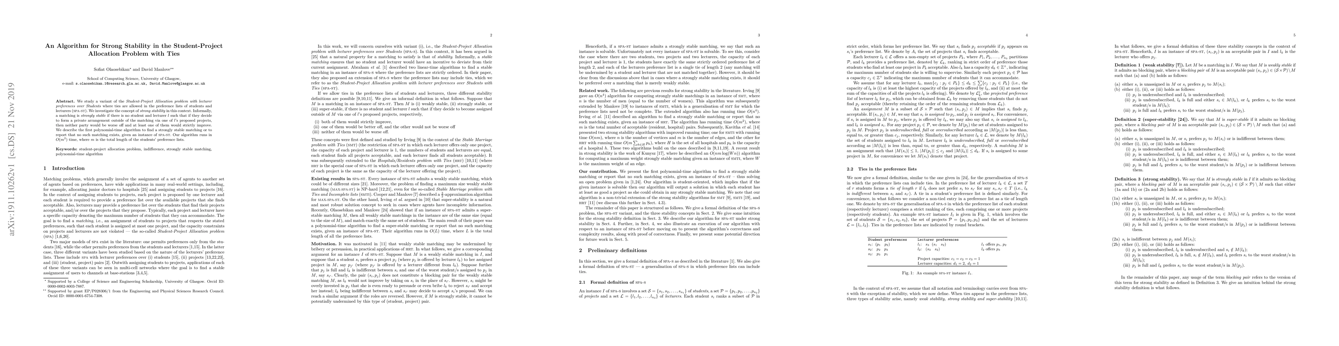 We study a variant of the Student-Project Allocation problem with lecturer preferences over Students where ties are allowed in the preference lists of students and lecturers (SPA-ST). We investigate the concept of strong stability in this context. Informally, a matching is strongly stable if there is no student and lecturer $l$ such that if they decide to form a private arrangement outside of the matching via one of $l$'s proposed projects, then neither party would be worse off and at least one of them would strictly improve. We describe the first polynomial-time algorithm to find a strongly stable matching or to report that no such matching exists, given an instance of SPA-ST. Our algorithm runs in $O(m^2)$ time, where $m$ is the total length of the students' preference lists.
