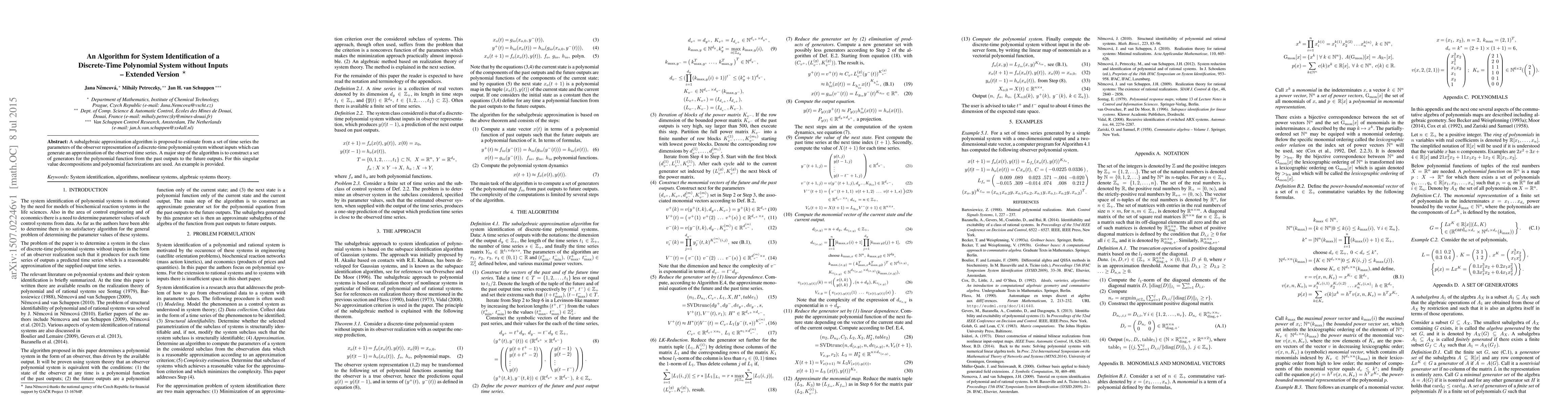 A subalgebraic approximation algorithm is proposed to estimate from a set of time series the parameters of the observer representation of a discrete-time polynomial system without inputs which can generate an approximation of the observed time series. A major step of the algorithm is to construct a set of generators for the polynomial function from the past outputs to the future outputs. For this singular value decompositions and polynomial factorizations are used. An example is provided.
