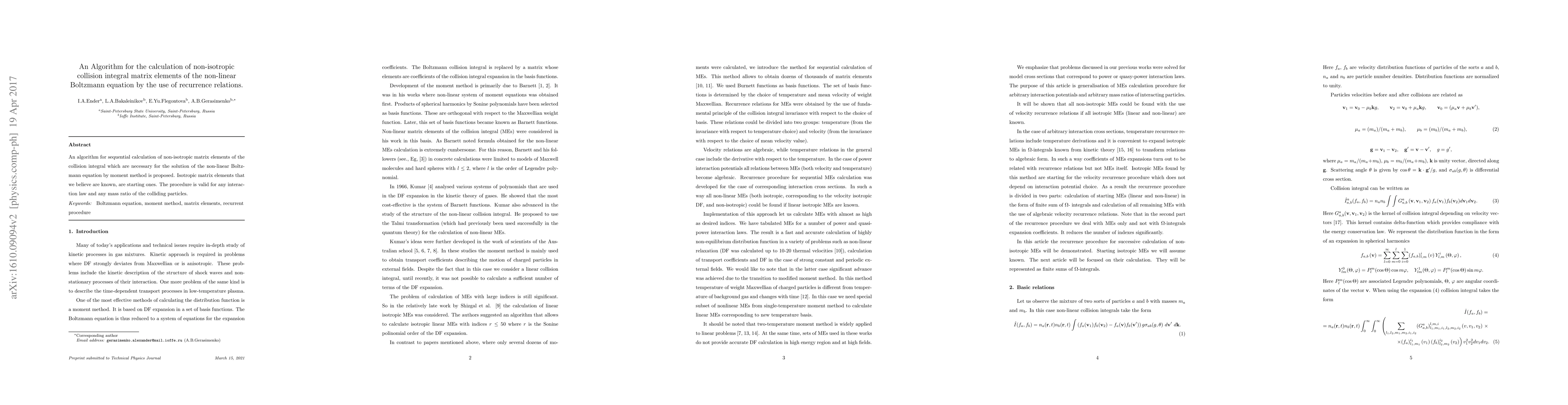This paper proposes an algorithm for calculating non-isotropic collision integral matrix elements for the non-linear Boltzmann equation using recurrence relations. It starts from known isotropic matrix elements and is applicable to any interaction law and mass ratio of particles.