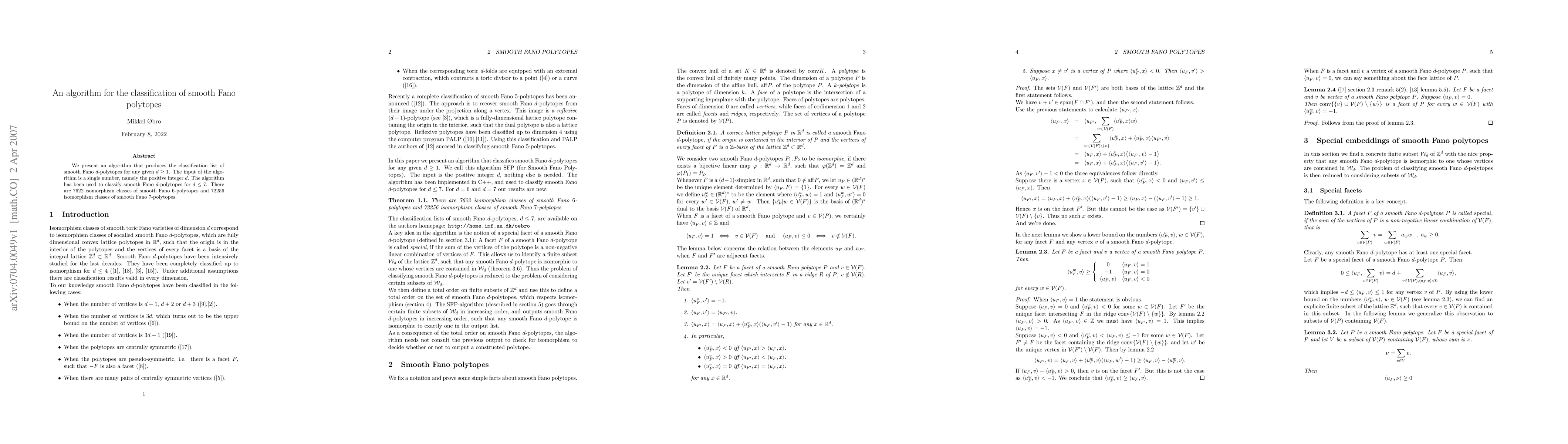 This paper introduces an algorithm for classifying smooth Fano polytopes of any dimension d, successfully classifying them up to dimension 7, revealing 7622 classes for d=6 and 72256 classes for d=7. The algorithm takes a single input, the dimension d, to generate the classification list.