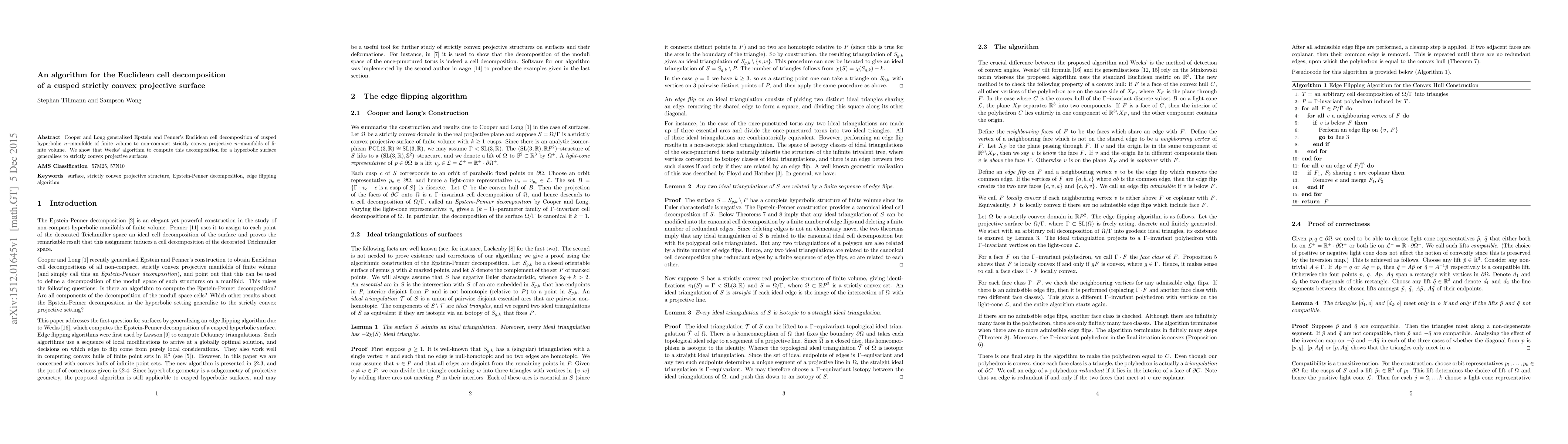 Summary: Cooper and Long extend Weeks' algorithm for Euclidean cell decomposition from hyperbolic surfaces to non-compact strictly convex projective surfaces, generalising Epstein and Penner's original method for hyperbolic manifolds.