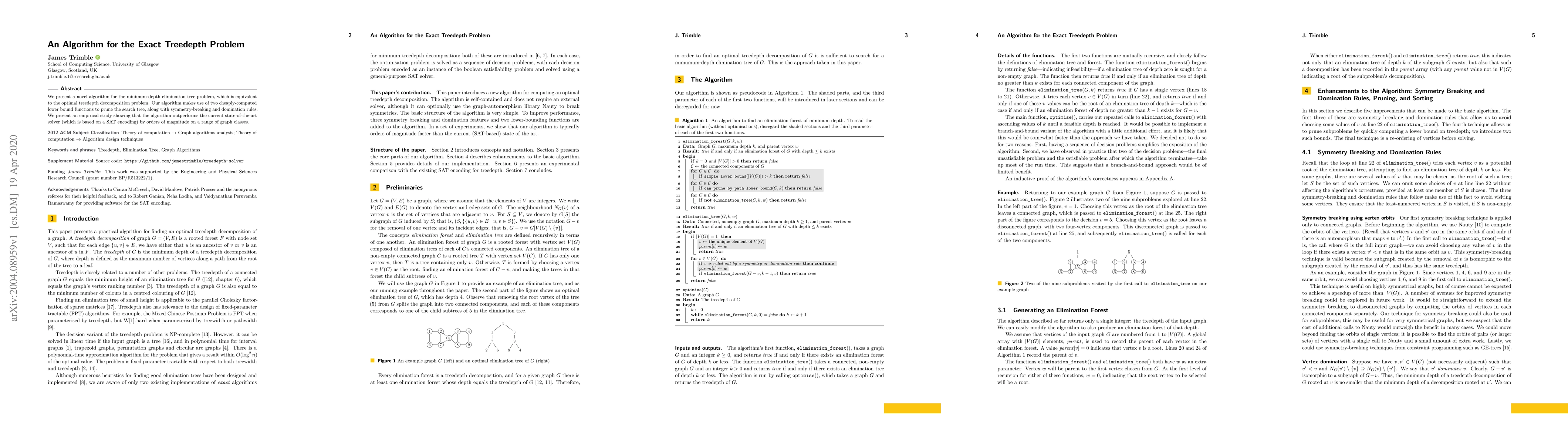 A novel algorithm for the minimum-depth elimination tree problem outperforms current state-of-the-art solvers by orders of magnitude on various graph classes, using cheaply-computed lower bound functions and symmetry-breaking techniques.