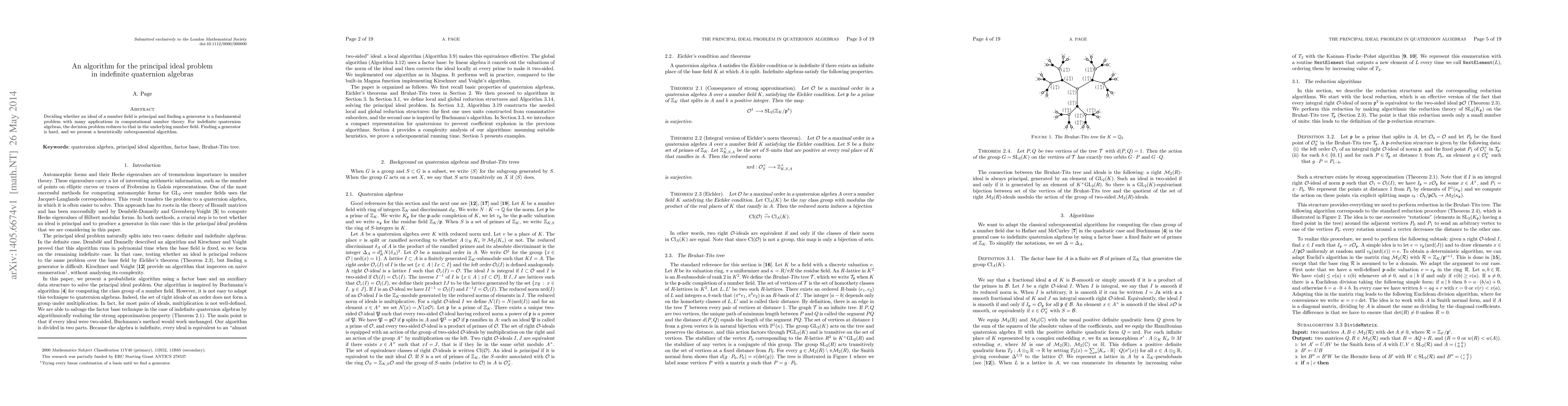 Summary: This paper presents a heuristically subexponential algorithm to determine if an ideal in indefinite quaternion algebras is principal, reducing the problem to the underlying number field and addressing the challenging task of finding a generator.