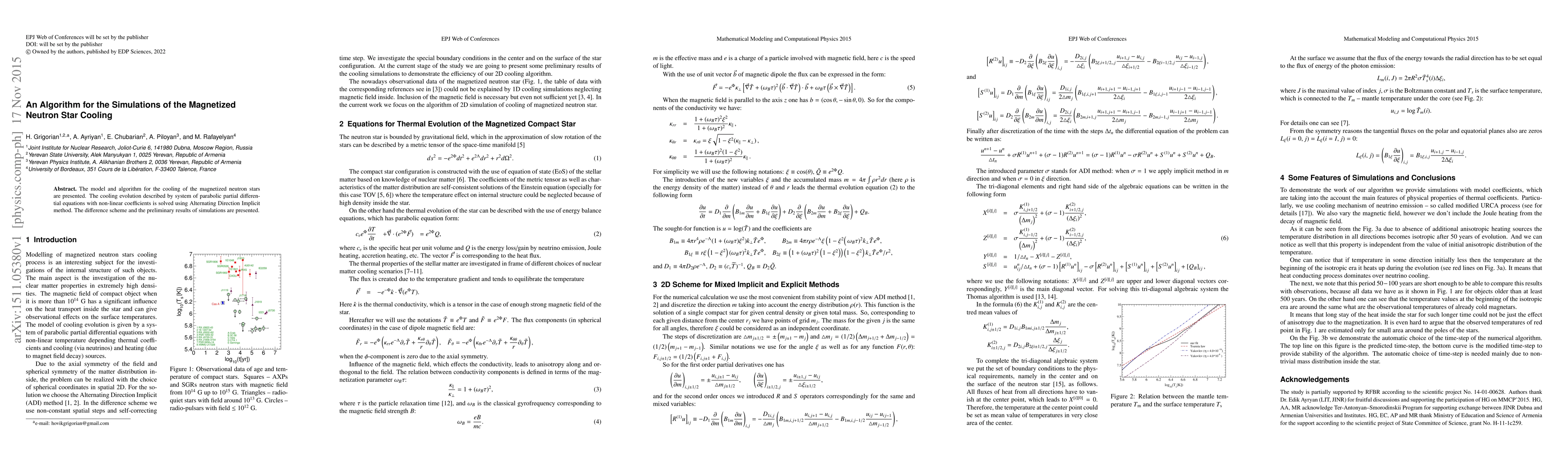 The model and algorithm for the cooling of the magnetized neutron stars are presented. The cooling evolution described by system of parabolic partial differential equations with non-linear coefficients is solved using Alternating Direction Implicit method. The difference scheme and the preliminary results of simulations are presented.