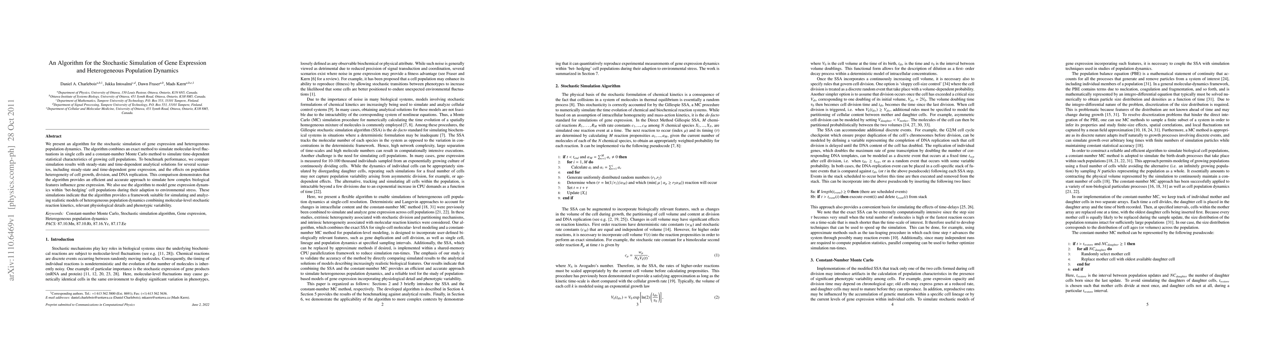 This paper introduces an algorithm merging an exact method for simulating gene expression fluctuations in single cells with a Monte Carlo approach for modeling population dynamics. The algorithm is shown to efficiently and accurately capture the effects of molecular-level stochasticity and physiological details on gene expression and population heterogeneity, validated against analytical solutions and applied to "bet-hedging" behaviors under environmental stress.