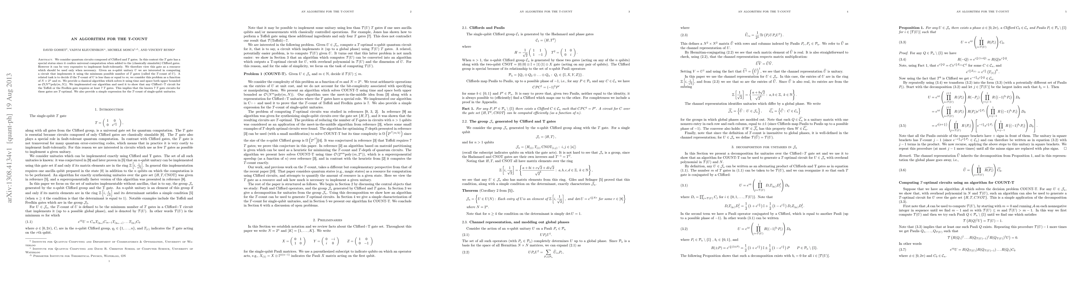 This paper presents a classical algorithm to determine the minimum number of T gates (T-count) required to implement a given n-qubit unitary U, optimizing for minimal T gate usage. The algorithm runs in O(N^m poly(m,N)) time and space, demonstrating its efficiency with applications to proving the optimality of known circuits for the Toffoli and Fredkin gates.