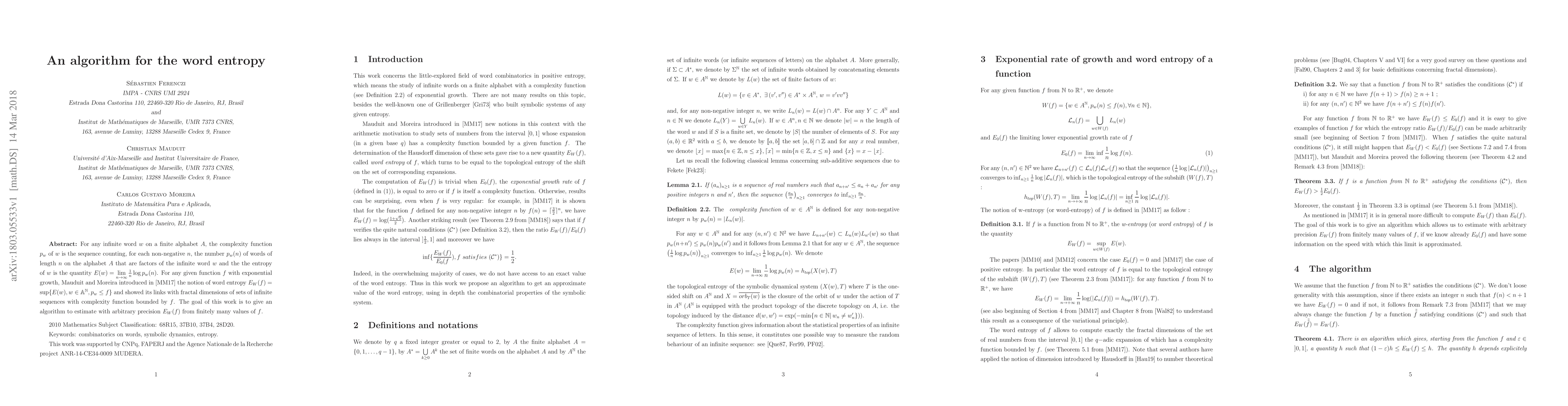This paper presents an algorithm to estimate the word entropy $E_W(f)$ with arbitrary precision using finitely many values of $f$, which measures the complexity of infinite words on a finite alphabet. The algorithm leverages the fractal dimension connections introduced by Mauduit and Moreira.