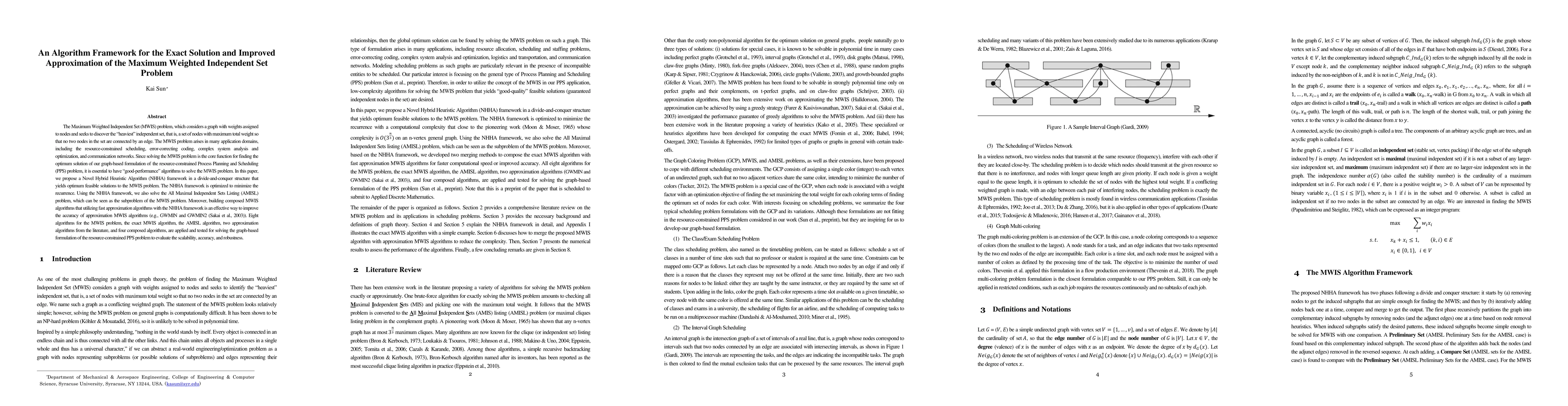 This paper proposes a Novel Hybrid Heuristic Algorithm (NHHA) framework for solving the Maximum Weighted Independent Set (MWIS) problem, which seeks the heaviest independent set in a weighted graph. The NHHA framework, optimized in a divide-and-conquer approach, also addresses the All Maximal Independent Sets Listing (AMISL) problem and enhances the accuracy of existing approximation algorithms. Eight algorithms are tested for scalability, accuracy, and robustness in solving a resource-constrained Process Planning and Scheduling problem.
