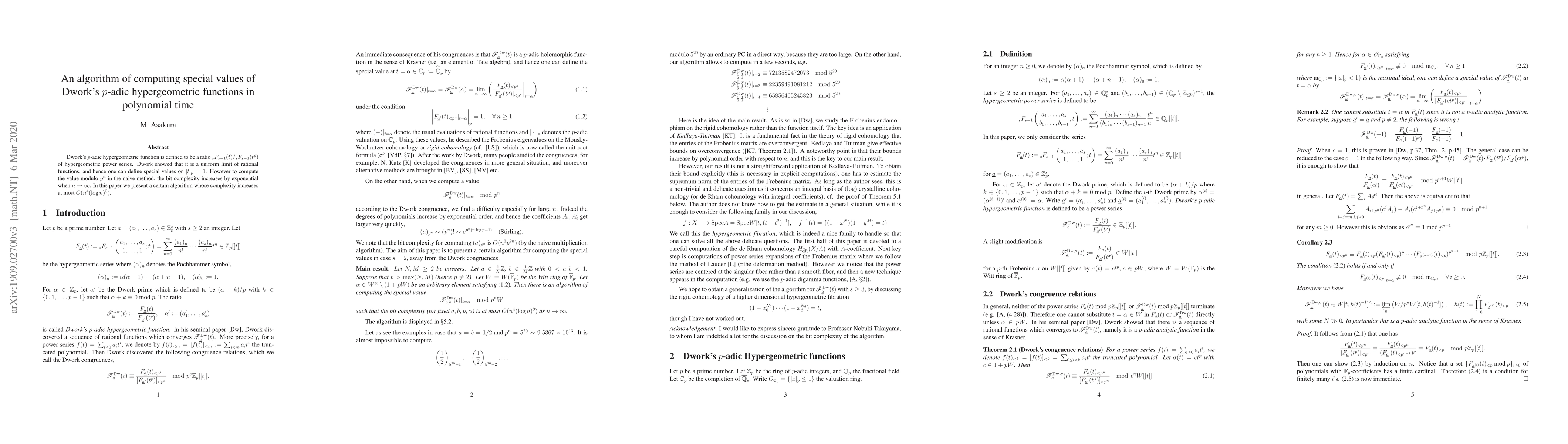 Researchers developed an algorithm to compute special values of Dwork's p-adic hypergeometric function in polynomial time, improving on the naive method's exponential complexity for large inputs.