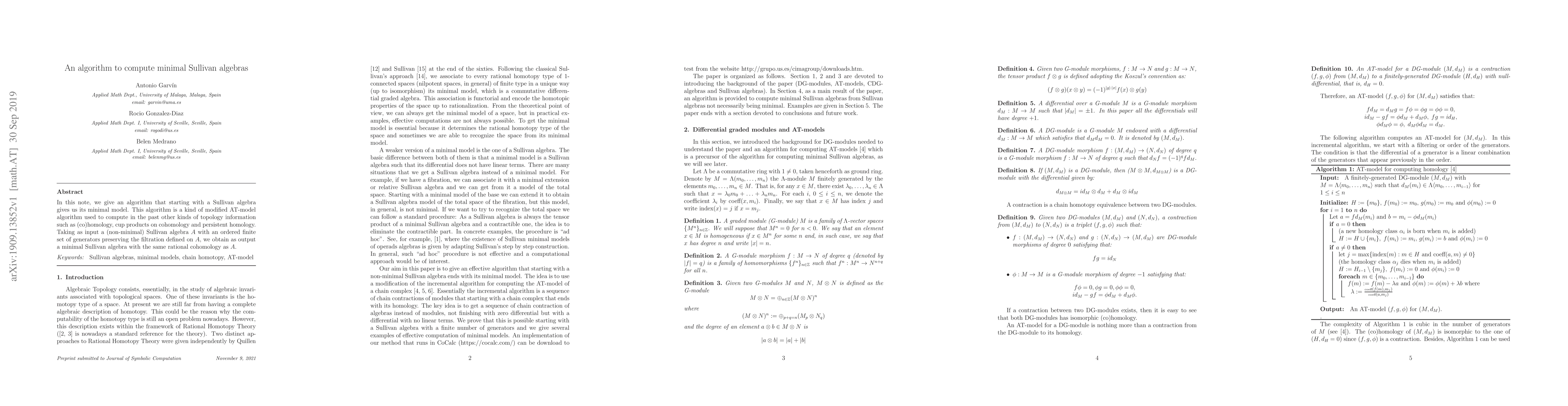 In this note, we give an algorithm that starting with a Sullivan algebra gives us its minimal model. This algorithm is a kind of modified AT-model algorithm used to compute in the past other kinds of topology information such as (co)homology, cup products on cohomology and persistent homology. Taking as input a (non-minimal) Sullivan algebra $A$ with an ordered finite set of generators preserving the filtration defined on $A$, we obtain as output a minimal Sullivan algebra with the same rational cohomology as $A$.