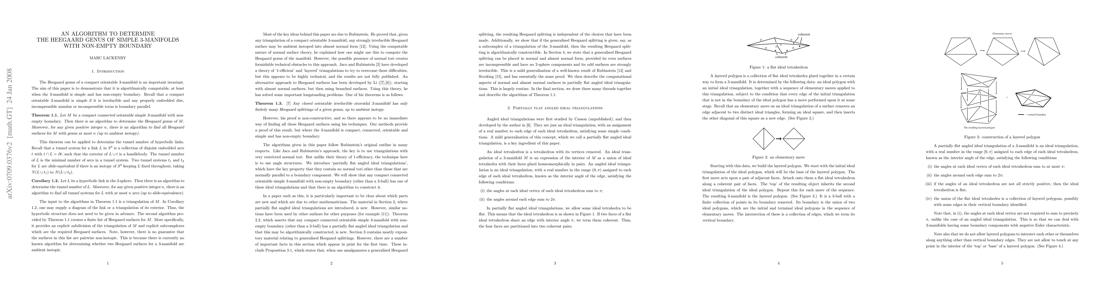 We provide an algorithm to determine the Heegaard genus of simple 3-manifolds with non-empty boundary. More generally, we supply an algorithm to determine (up to ambient isotopy) all the Heegaard splittings of any given genus for the manifold. As a consequence, the tunnel number of a hyperbolic link is algorithmically computable. Our techniques rely on Rubinstein's work on almost normal surfaces, and also a new structure called a partially flat angled ideal triangulation.