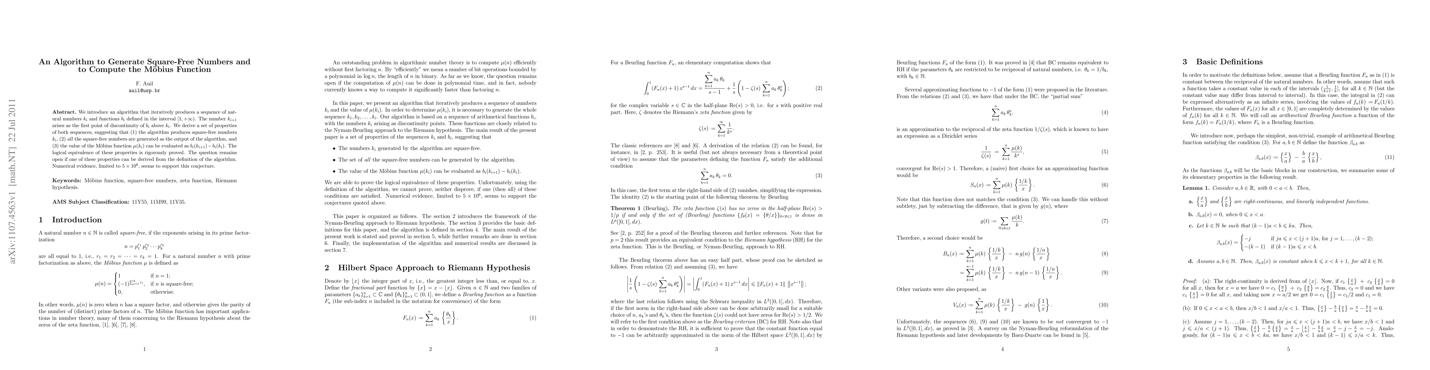 This paper presents an algorithm generating square-free numbers and computing the Moebius function. It proves that the algorithm produces all square-free numbers and evaluates the Moebius function via the difference between function values at specific points, with numerical evidence supporting these properties.