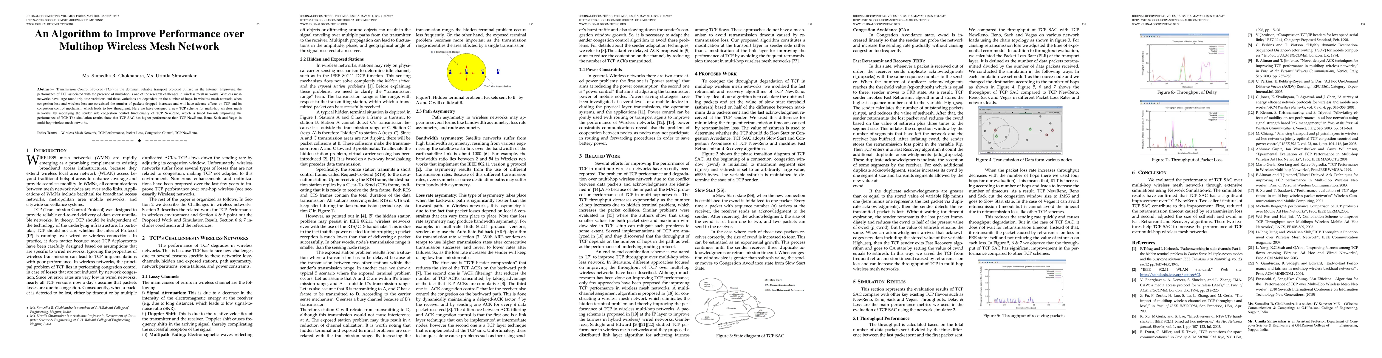 This paper proposes a new TCP scheme, TCP SAC, to enhance performance in multi-hop wireless mesh networks by modifying the congestion control mechanism of TCP NewReno. Simulation results demonstrate that TCP SAC outperforms TCP NewReno, Reno, Sack, and Vegas in such environments.