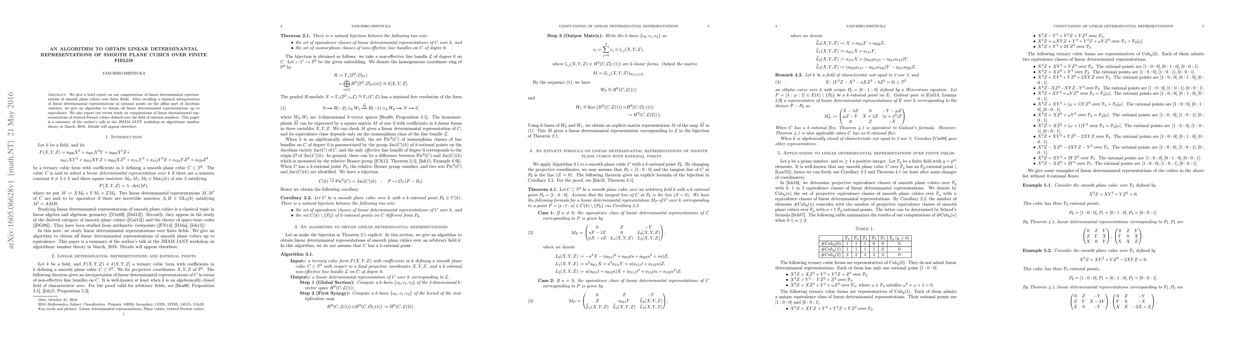 This paper presents an algorithm for deriving linear determinantal representations of smooth plane cubics over finite fields and discusses its application to twisted Fermat cubics. The work summarizes the author's presentation at the JSIAM JANT workshop, with full details forthcoming.