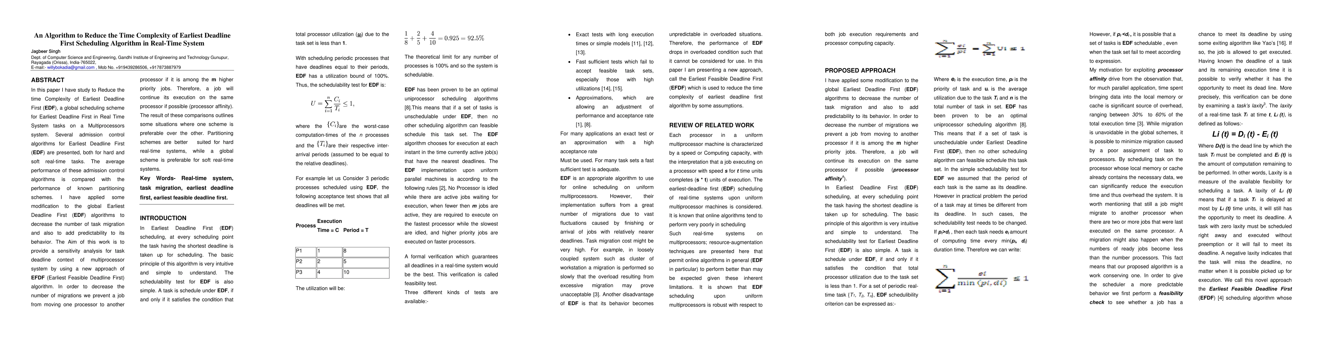 This research paper proposes an algorithm to reduce time complexity of Earliest Deadline First (EDF) scheduling in real-time systems, with a focus on improving performance and predictability for multiprocessor systems.