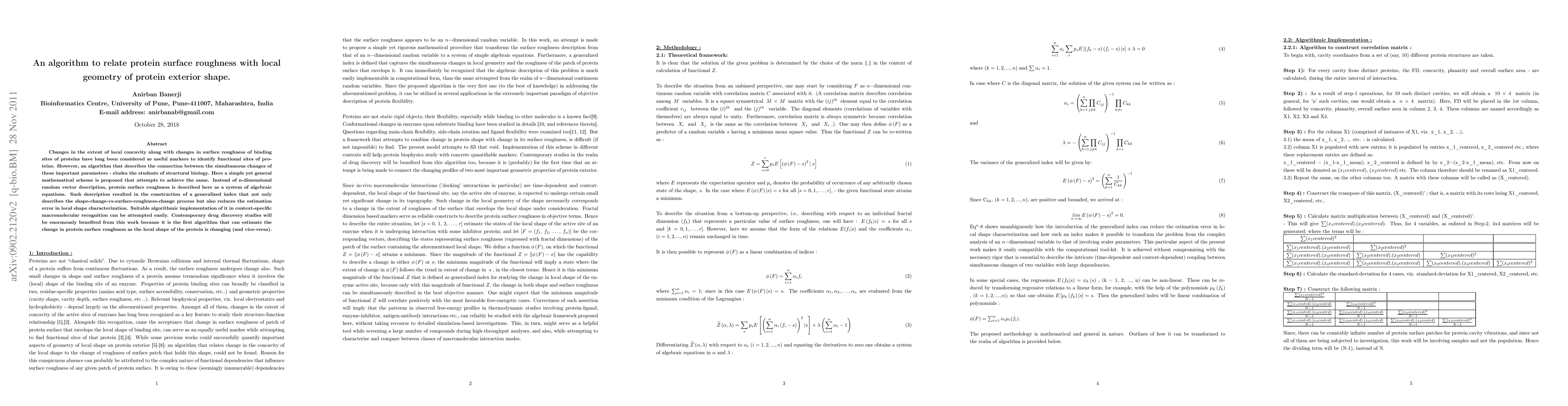 Changes in the extent of local concavity along with changes in surface roughness of binding sites of proteins have long been considered as useful markers to identify functional sites of proteins. However, an algorithm that describes the connection between the simultaneous changes of these important parameters - eludes the students of structural biology. Here a simple yet general mathematical scheme is proposed that attempts to achieve the same. Instead of n-dimensional random vector description, protein surface roughness is described here as a system of algebraic equations. Such description resulted in the construction of a generalized index that not only describes the shape-change-vs-surface-roughness-change process but also reduces the estimation error in local shape characterization. Suitable algorithmic implementation of it in context-specific macromolecular recognition can be attempted easily. Contemporary drug discovery studies will be enormously benefited from this work because it is the first algorithm that can estimate the change in protein surface roughness as the local shape of the protein is changing (and vice-versa).