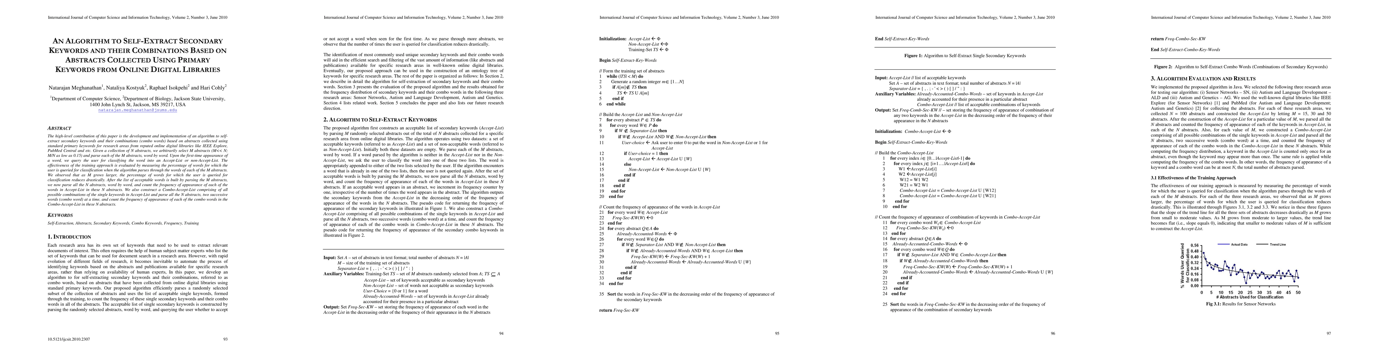 The high-level contribution of this paper is the development and implementation of an algorithm to selfextract secondary keywords and their combinations (combo words) based on abstracts collected using standard primary keywords for research areas from reputed online digital libraries like IEEE Explore, PubMed Central and etc. Given a collection of N abstracts, we arbitrarily select M abstracts (M<< N; M/N as low as 0.15) and parse each of the M abstracts, word by word. Upon the first-time appearance of a word, we query the user for classifying the word into an Accept-List or non-Accept-List. The effectiveness of the training approach is evaluated by measuring the percentage of words for which the user is queried for classification when the algorithm parses through the words of each of the M abstracts. We observed that as M grows larger, the percentage of words for which the user is queried for classification reduces drastically. After the list of acceptable words is built by parsing the M abstracts, we now parse all the N abstracts, word by word, and count the frequency of appearance of each of the words in Accept-List in these N abstracts. We also construct a Combo-Accept-List comprising of all possible combinations of the single keywords in Accept-List and parse all the N abstracts, two successive words (combo word) at a time, and count the frequency of appearance of each of the combo words in the Combo-Accept-List in these N abstracts.