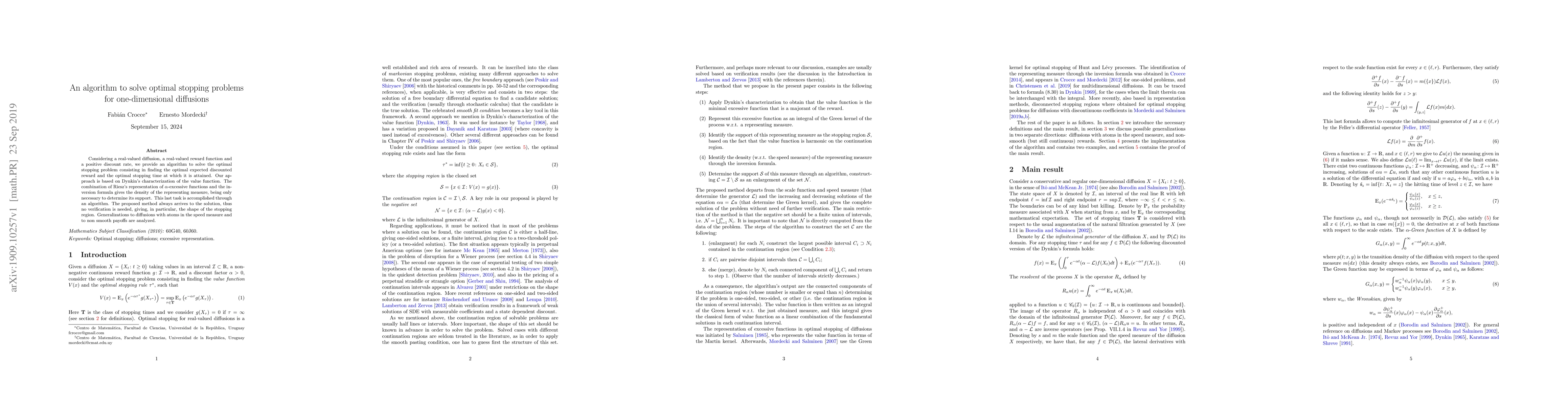 This paper presents an algorithm for solving optimal stopping problems for one-dimensional diffusions, based on Dynkin's value function characterization. The method determines the optimal stopping time and reward using Riesz's representation and an inversion formula, with a guaranteed solution for various diffusion types and payoff structures.