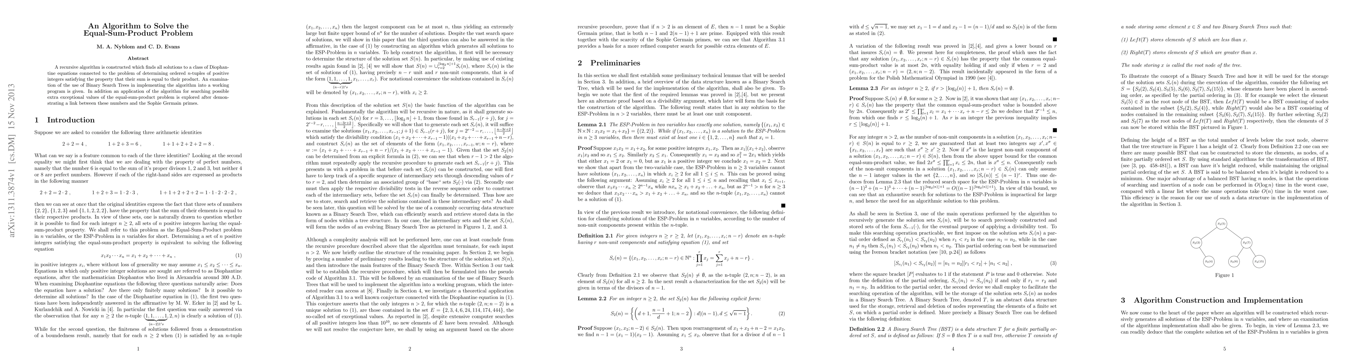 A recursive algorithm solves Diophantine equations where sum equals product for positive integers, utilizing Binary Search Trees to efficiently find solutions. The algorithm also explores connections between equal-sum-product numbers and Sophie Germain primes.
