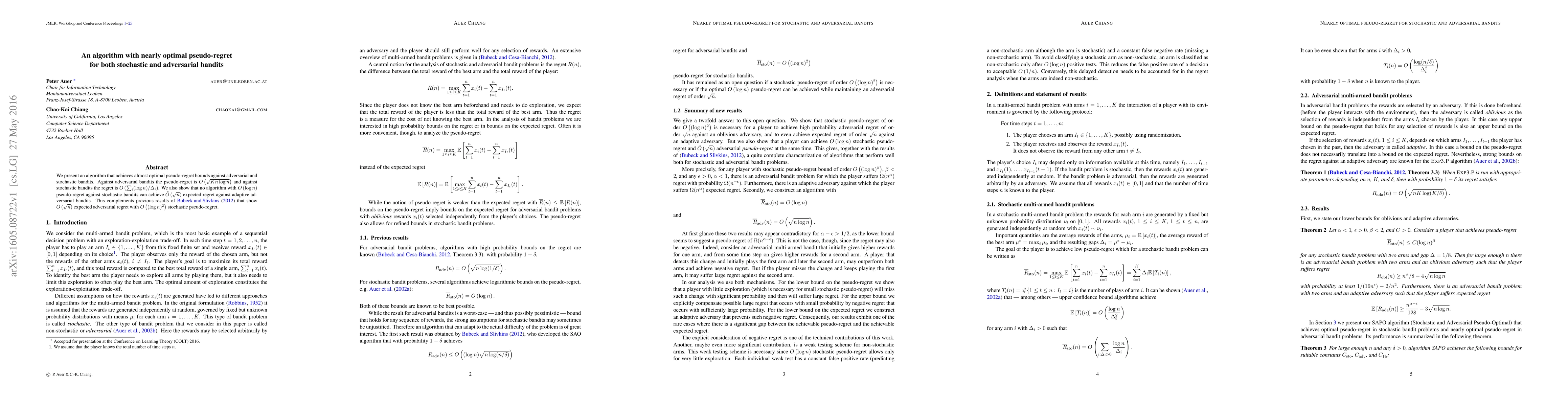 This paper introduces an algorithm achieving near-optimal pseudo-regret for both stochastic and adversarial multi-armed bandit problems, with $O(K\sqrt{n \log n})$ regret against adversarial and $O(\sum_i (\log n)/\Delta_i)$ against stochastic bandits. The work also proves a lower bound showing no algorithm can achieve both $O(\log n)$ pseudo-regret and $\tilde{O}(\sqrt{n})$ expected regret.