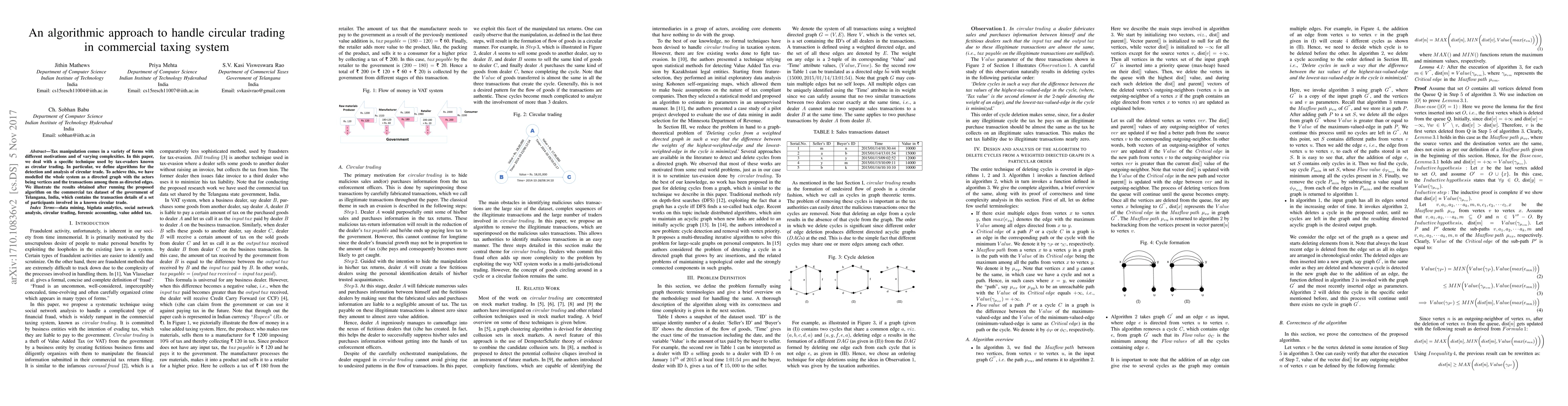 Tax manipulation comes in a variety of forms with different motivations and of varying complexities. In this paper, we deal with a specific technique used by tax-evaders known as circular trading. In particular, we define algorithms for the detection and analysis of circular trade. To achieve this, we have modelled the whole system as a directed graph with the actors being vertices and the transactions among them as directed edges. We illustrate the results obtained after running the proposed algorithm on the commercial tax dataset of the government of Telangana, India, which contains the transaction details of a set of participants involved in a known circular trade.
