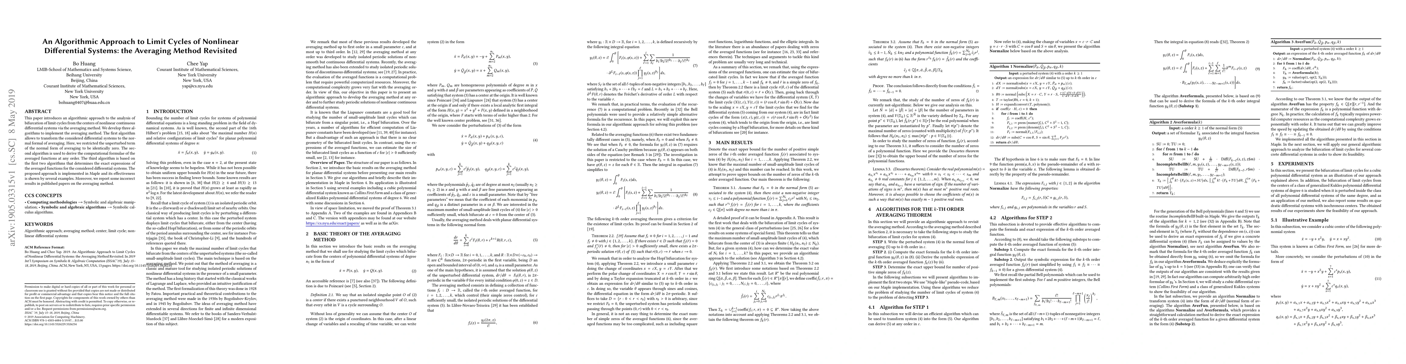 This paper introduces an algorithmic approach to the analysis of bifurcation of limit cycles from the centers of nonlinear continuous differential systems via the averaging method. We develop three algorithms to implement the averaging method. The first algorithm allows to transform the considered differential systems to the normal formal of averaging. Here, we restricted the unperturbed term of the normal form of averaging to be identically zero. The second algorithm is used to derive the computational formulae of the averaged functions at any order. The third algorithm is based on the first two algorithms that determines the exact expressions of the averaged functions for the considered differential systems. The proposed approach is implemented in Maple and its effectiveness is shown by several examples. Moreover, we report some incorrect results in published papers on the averaging method.