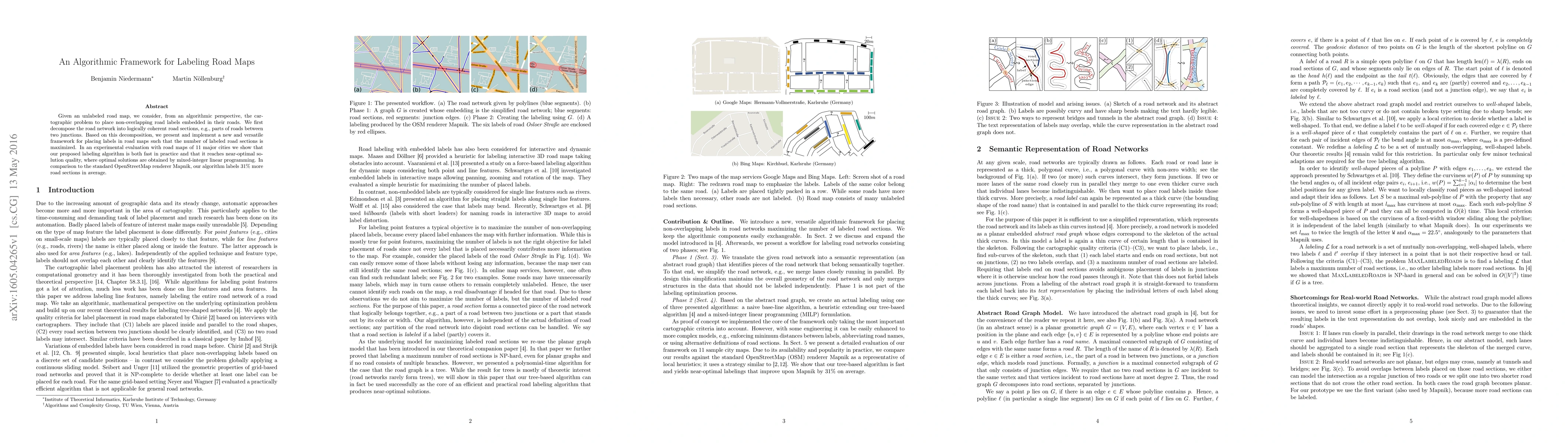 This paper presents an algorithmic framework for placing non-overlapping road labels on maps, decomposing the road network into coherent sections and maximizing the number of labeled roads. Experimental results show the algorithm is both efficient and near-optimal, outperforming the standard OpenStreetMap renderer Mapnik by labeling 31% more road sections.