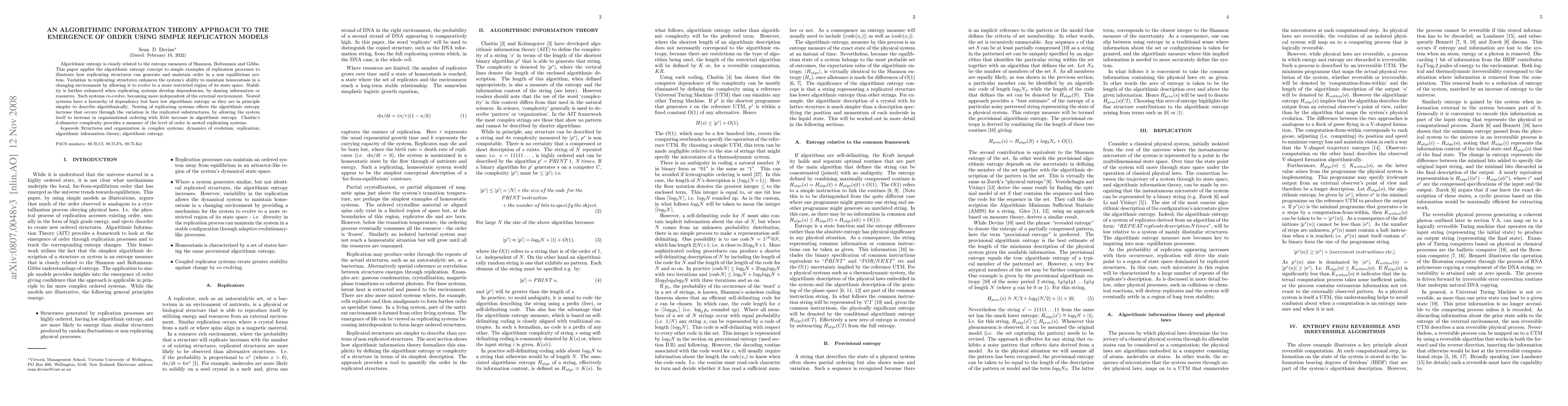 This paper applies Algorithmic Information Theory to simple examples of replication processes to illustrate how replicating structures can generate and maintain order in a non equilibrium system. Variation in replicating structures enhances the system's ability to maintain homeostasis in a changing environment by allowing it to evolve to a more restricted region of its state space. Stability is further enhanced when replicating systems develop dependencies, by sharing information or resources. Such systems co-evolve, becoming more independent of the external environment. Nested systems have a hierarchy of dependency but have low algorithmic entropy as they are in principle simpler to describe algorithmically. Nesting of replicating systems offsets the need for increased variety by allowing the structures to increase in organizational complexity with little increase in algorithmic entropy. Chaitin's d-diameter complexity provides a measure of the level of order in nested replicating systems.