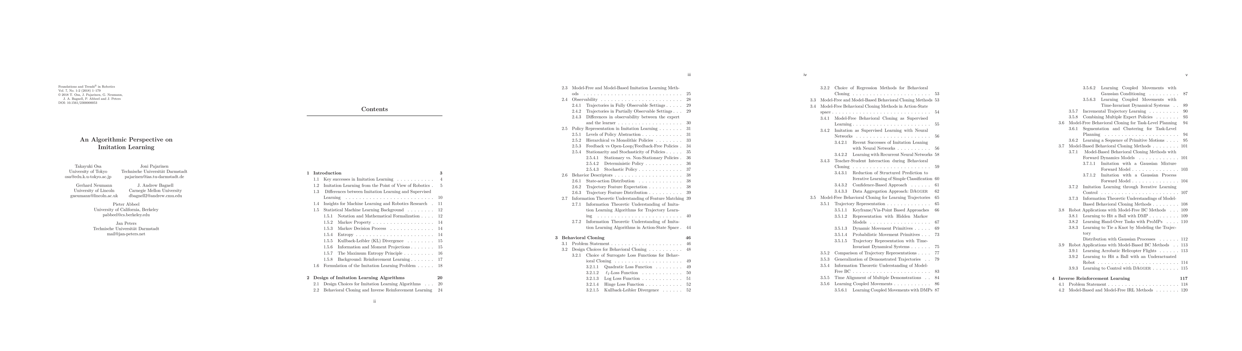 As robots and other intelligent agents move from simple environments and problems to more complex, unstructured settings, manually programming their behavior has become increasingly challenging and expensive. Often, it is easier for a teacher to demonstrate a desired behavior rather than attempt to manually engineer it. This process of learning from demonstrations, and the study of algorithms to do so, is called imitation learning. This work provides an introduction to imitation learning. It covers the underlying assumptions, approaches, and how they relate; the rich set of algorithms developed to tackle the problem; and advice on effective tools and implementation. We intend this paper to serve two audiences. First, we want to familiarize machine learning experts with the challenges of imitation learning, particularly those arising in robotics, and the interesting theoretical and practical distinctions between it and more familiar frameworks like statistical supervised learning theory and reinforcement learning. Second, we want to give roboticists and experts in applied artificial intelligence a broader appreciation for the frameworks and tools available for imitation learning.