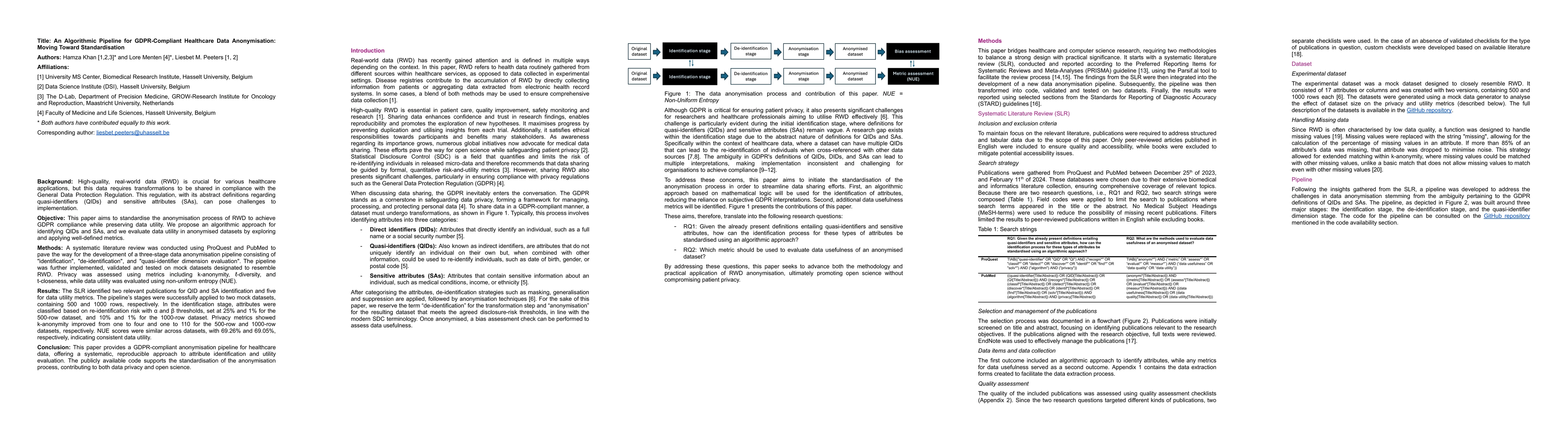 High-quality real-world data (RWD) is essential for healthcare but must be transformed to comply with the General Data Protection Regulation (GDPR). GDPRs broad definitions of quasi-identifiers (QIDs) and sensitive attributes (SAs) complicate implementation. We aim to standardise RWD anonymisation for GDPR compliance while preserving data utility by introducing an algorithmic method to identify QIDs and SAs and evaluate utility in anonymised datasets. We conducted a systematic literature review via ProQuest and PubMed to inform a three-stage anonymisation pipeline: identification, de-identification, and quasi-identifier dimension evaluation. The pipeline was implemented, validated, and tested on two mock RWD datasets (500 and 1000 rows). Privacy was assessed using k-anonymity, l-diversity, and t-closeness; utility was measured by non-uniform entropy (NUE). The review yielded two studies on QID/SA identification and five on utility metrics. Applying the pipeline, attributes were classified by re-identification risk using alpha and beta thresholds (25 percent/1 percent for 500 rows; 10 percent/1 percent for 1000 rows). Privacy metrics improved k-anonymity from 1 to 4 (500 rows) and 1 to 110 (1000 rows). NUE scores were 69.26 percent and 69.05 percent, respectively, indicating consistent utility despite varying privacy gains. We present a GDPR-compliant anonymisation pipeline for healthcare RWD that provides a reproducible approach to QID/SA identification and utility evaluation; publicly available code promotes standardisation, data privacy, and open science.