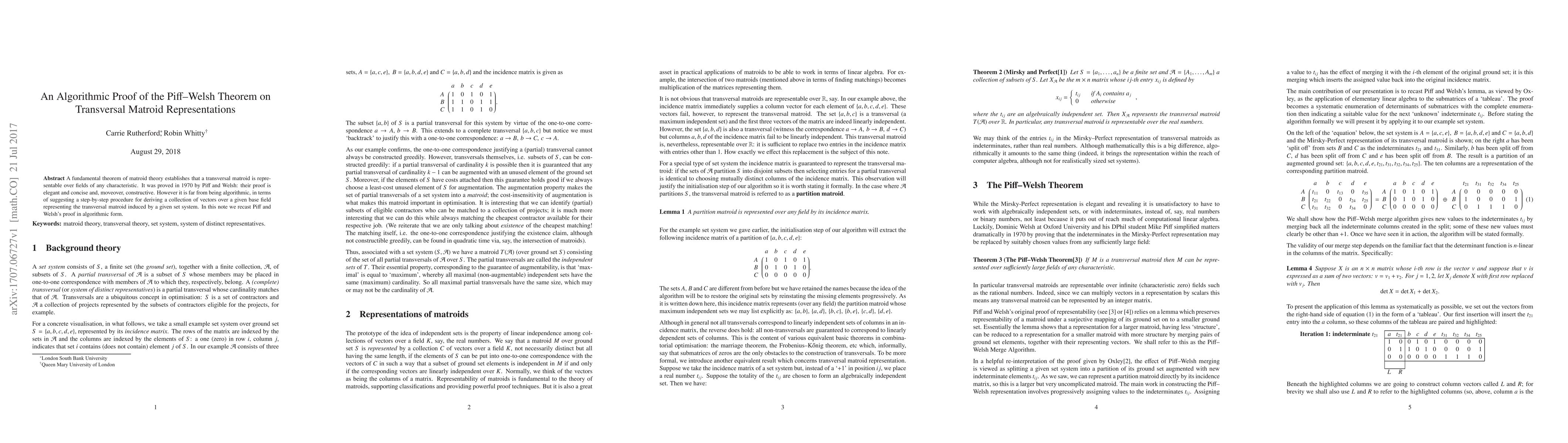 This paper provides an algorithmic proof of the Piff-Welsh theorem, which establishes that transversal matroids can be represented over any field. The original proof was elegant but non-algorithmic; this work aims to offer a step-by-step procedure for constructing the required vector representations.