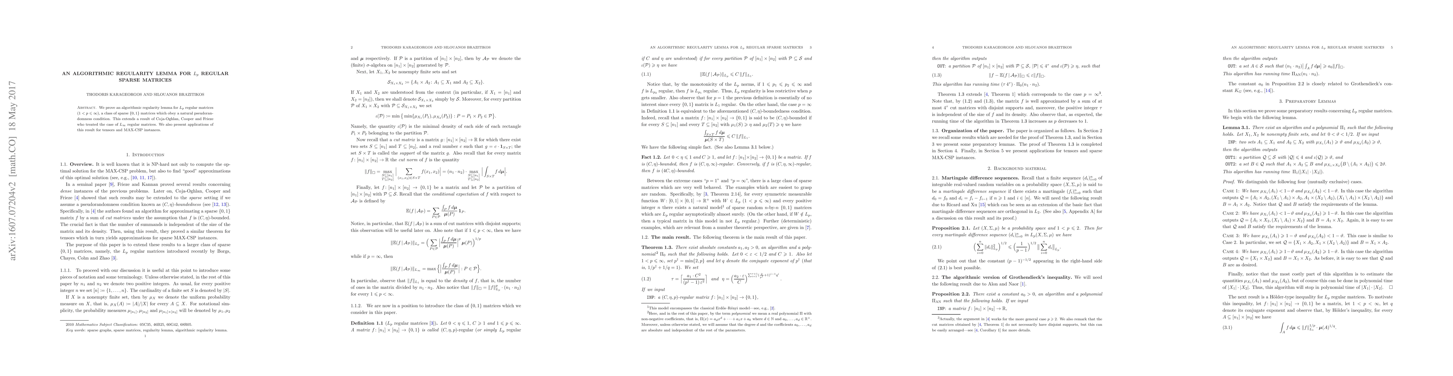 Researchers develop an algorithmic regularity lemma for sparse matrices with pseudorandomness condition, extending previous work on $L_{ty}$ regular matrices to the broader class of $L_p$ regular matrices.